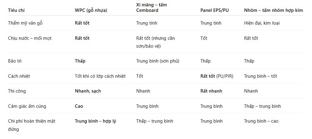 Gợi ý: Kết hợp tường panel cách nhiệt cho hiệu suất nhiệt – âm, ốp mặt tiền WPC cho thẩm mỹ vân gỗ. Đây là cấu hình phổ biến cho nhà ở – homestay.