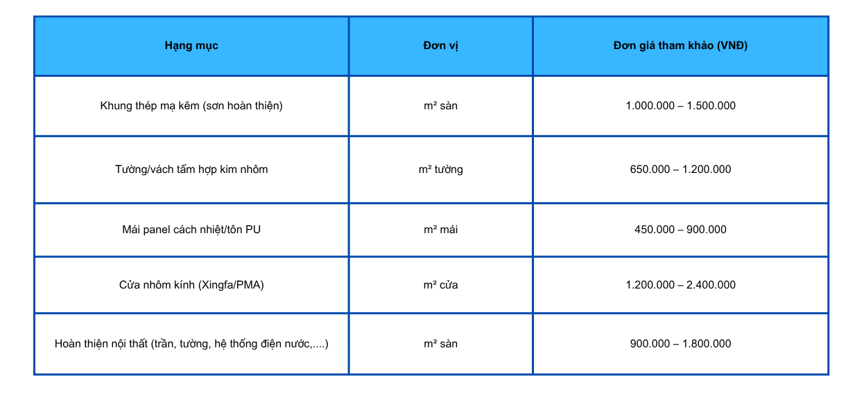 Bảng giá tham khảo nhà lắp ghép tấm hợp kim nhôm (2025)