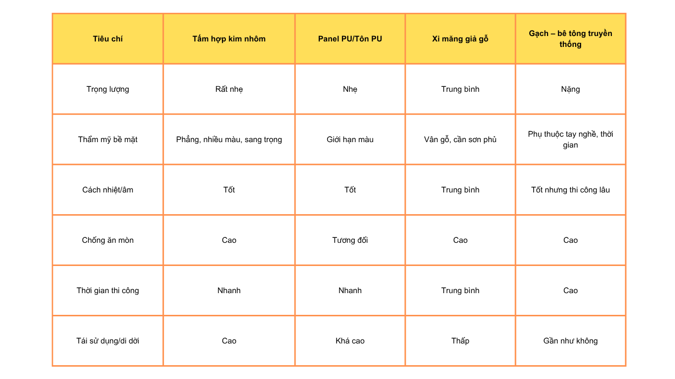 Nhà tấm nhôm thường nhỉnh hơn panel PU về thẩm mỹ, bề mặt; giá dao động tùy cấu hình. So với xi măng giả gỗ, tấm nhôm nhẹ hơn, dễ gia công, nhưng cảm giác “gỗ thật” sẽ thấp hơn.