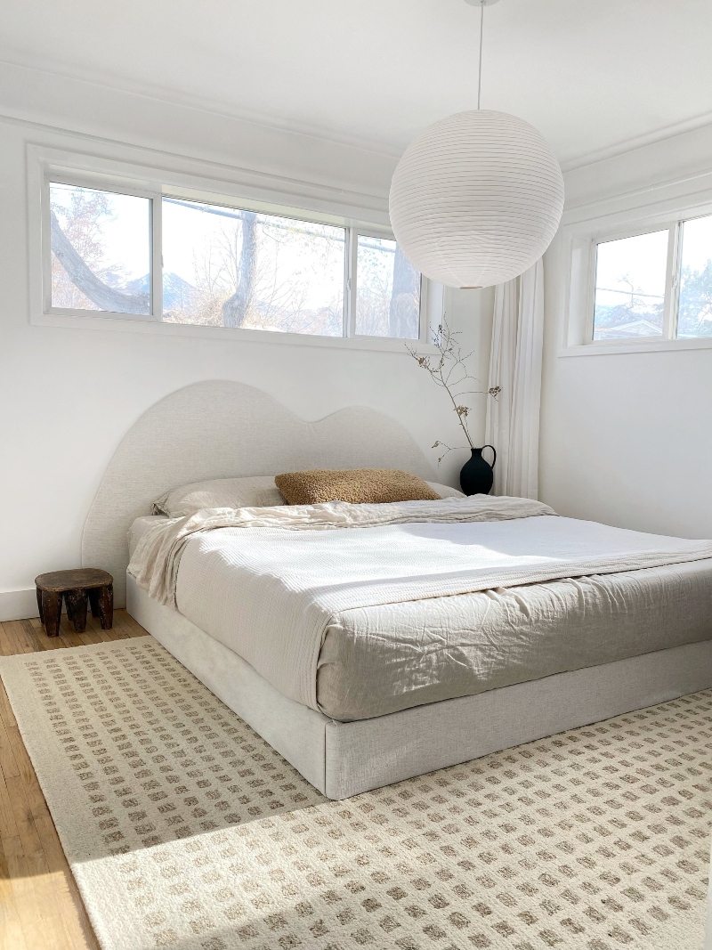 - Giường gỗ thấp, chăn ga màu nhạt.