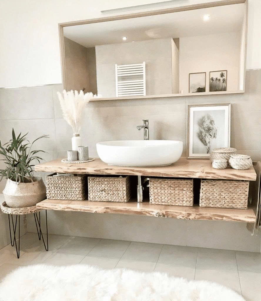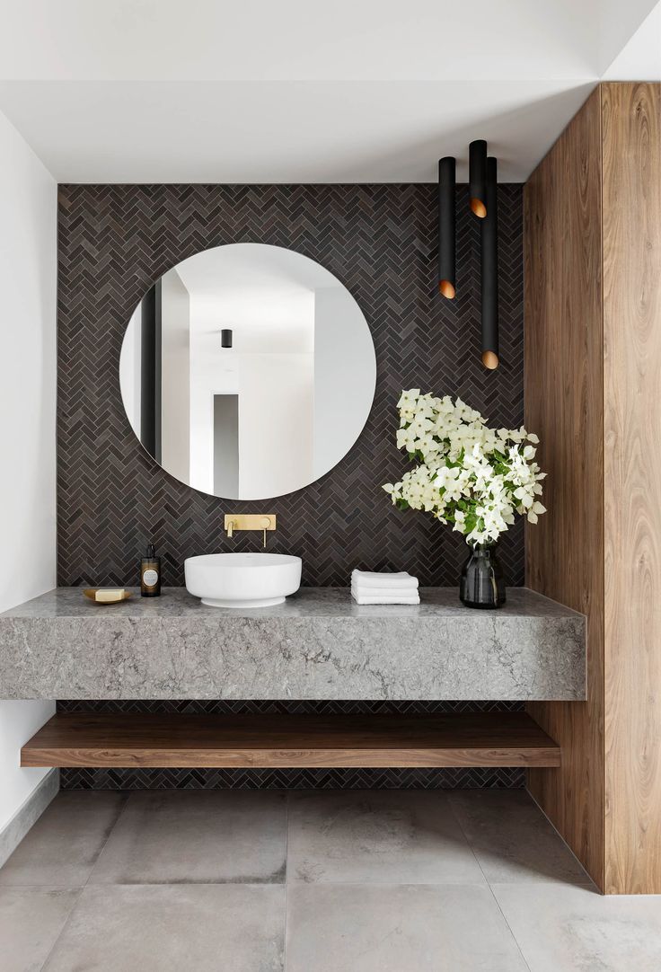 - Gương tròn lớn, lavabo đơn sắc, phụ kiện tối giản.